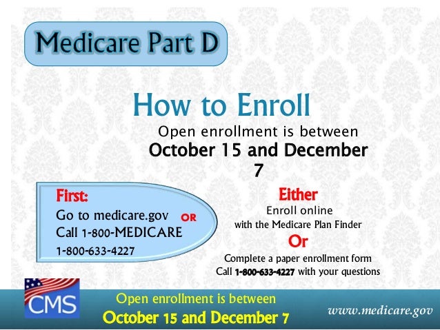 Call medicare part d. Medicare Part D is prescription drug coverage. When Can You Enroll in Medicare Part D. This information is not a complete description of benefits.