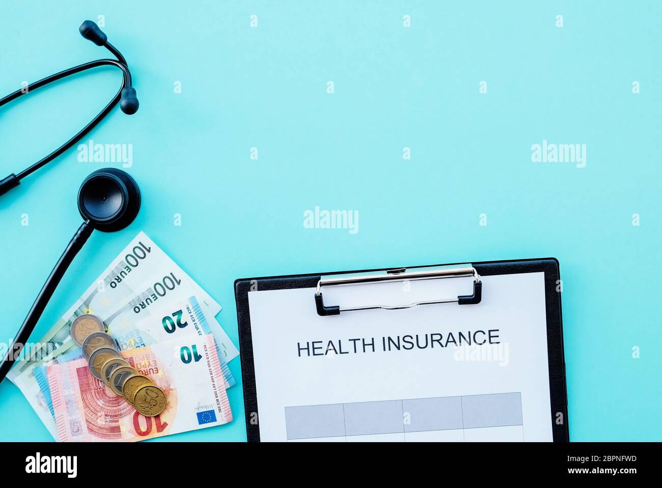 Stethoscope Health Insurance Form And Euro Money Coins On Light Blue Background Stock Photo Alamy